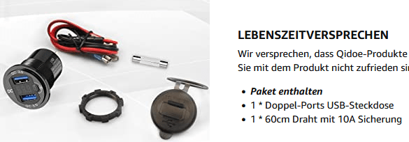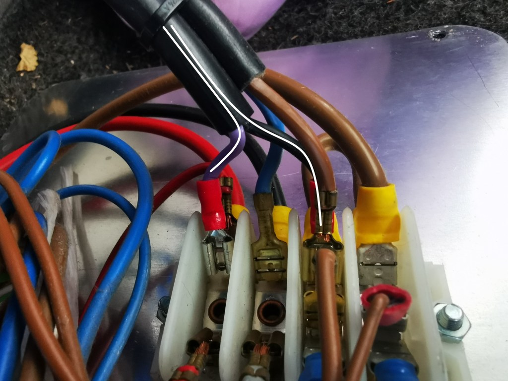Wir haben nun eine USB-Steckdose im Wohnmobil. Sie ist in der Wand zwischen Beifahrersitz und den Sitzen am Tisch. Sitzt oder liegt nun jemand dort, kann man Geräte verwenden wenn sie angeschlossen sind. Das Bild links zeigt die Verschaltung auf der Schalttafel unter dem Beifahrersitz. Dort ist ja die Verbraucherbatterie. Ich habe die Adern der zweipoligen Leitung mit weißen Linien deutlicher gemacht. Die Ader in lila ist plus. Das ganze ist nun mit einer 6,3 A – Sicherung angesichert. Die mitgelieferte 10 A war kaputt und OBI hatte nur 6,3 A.