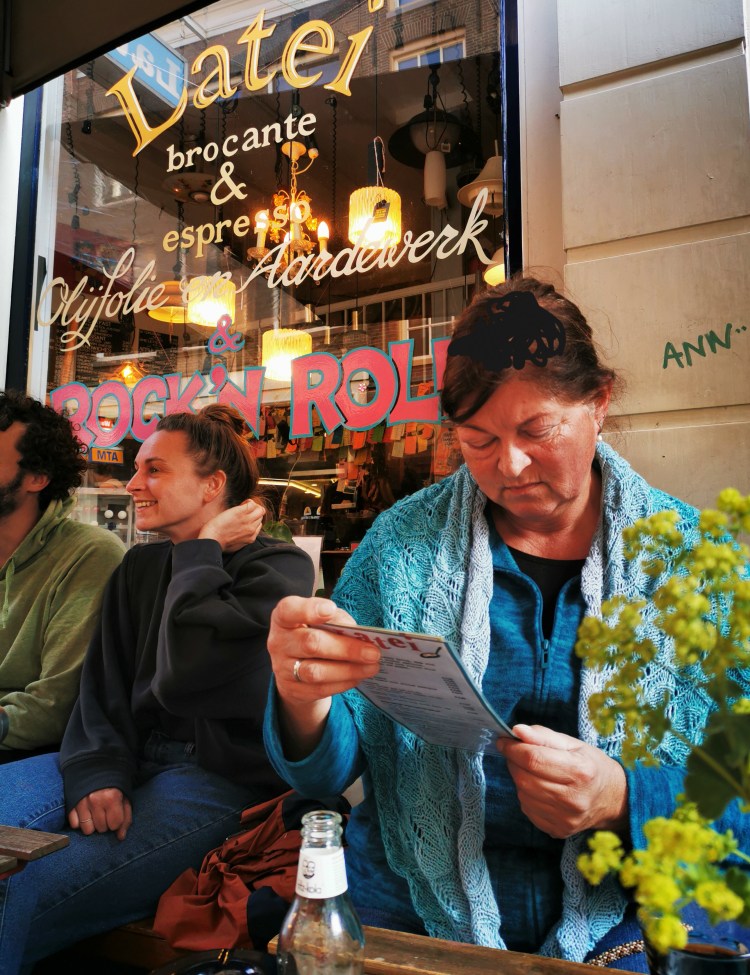 Ich habe es mir nicht nehmen lassen Amsterdam auch mal bei Nacht zu erleben. Auch das moderne Amsterdam haben wir uns angeschaut und wir waren vegetarisch essen. Auf unserer Nachttour sahen wir vor einem Lokal viele Leute anstehen. Deshalb hatten wir angenommen, daß es dort gutes asiatisches Essen gibt. Abends servieren sie das wirklich, aber tagsüber gibt es nur vegetarische Snacks. Wir hatten jeder ein Stück leckere Quiche. Anschließend war ich bei einem chinesischen Frisör gleich gegenüber. Bruce hatte Coffee Verkeert genauso gerne wie wir. Wenn es mal regnete, was aber selten war, machten wir es uns gemütlich, spielten auf dem IPad oder Frank übte Bass.
