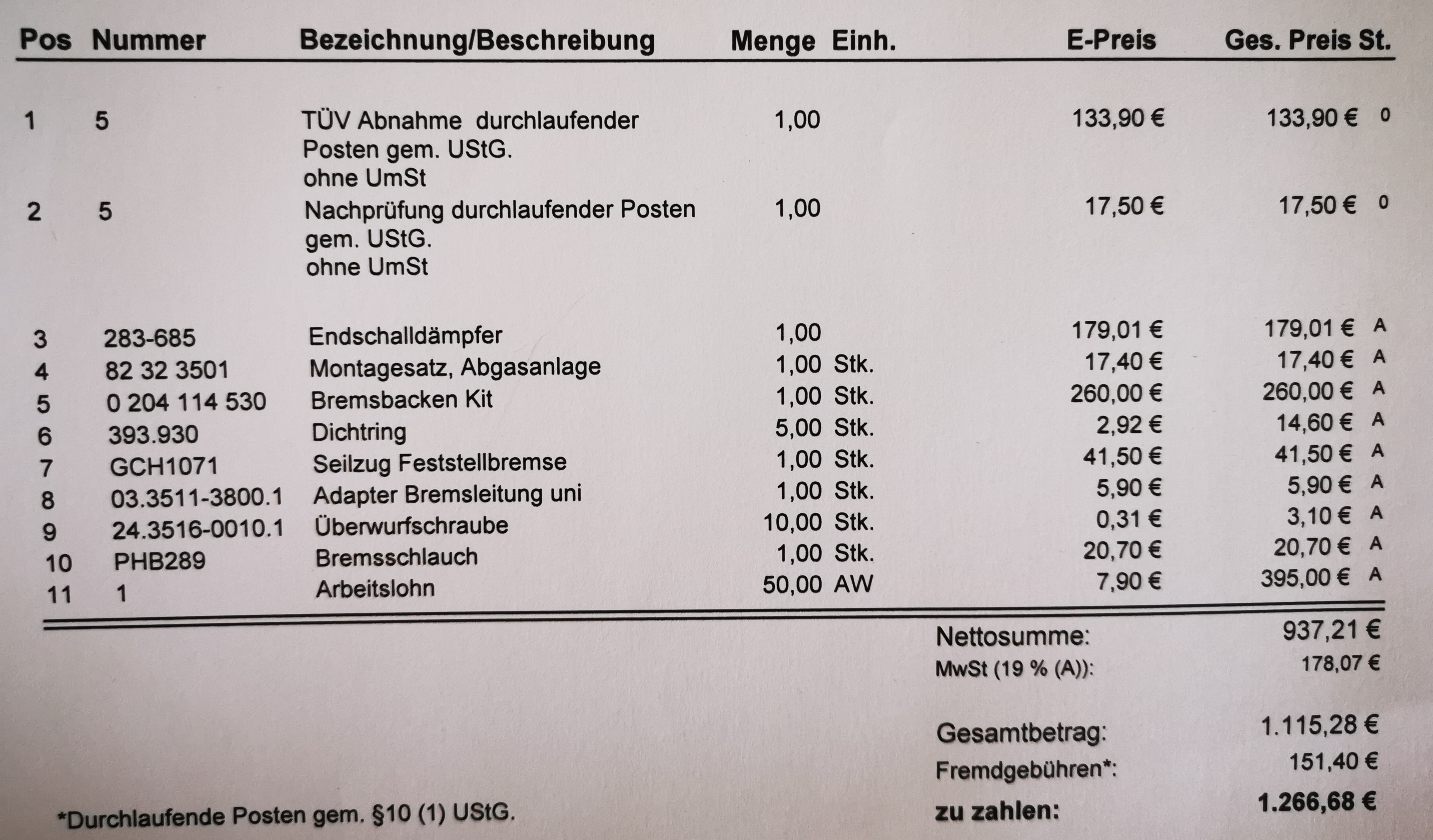 Reparaturen für den TÜV Verfasst vonF Engels31. März 20221. April 2022Veröffentlicht inTechnikSchlagwörter:Chassis Eigentlich sollte unser Womo nur neu TÜV bekommen. Aber der Prüfer hat dann einiges zu bemängeln gehabt. Aber es ist je nur zu unserer Sicherheit. Nun haben wir neue Bremsen, einen neuen Auspuff und einiges mehr. Gefällt mir Wird geladen … Ähnliche Beiträge
