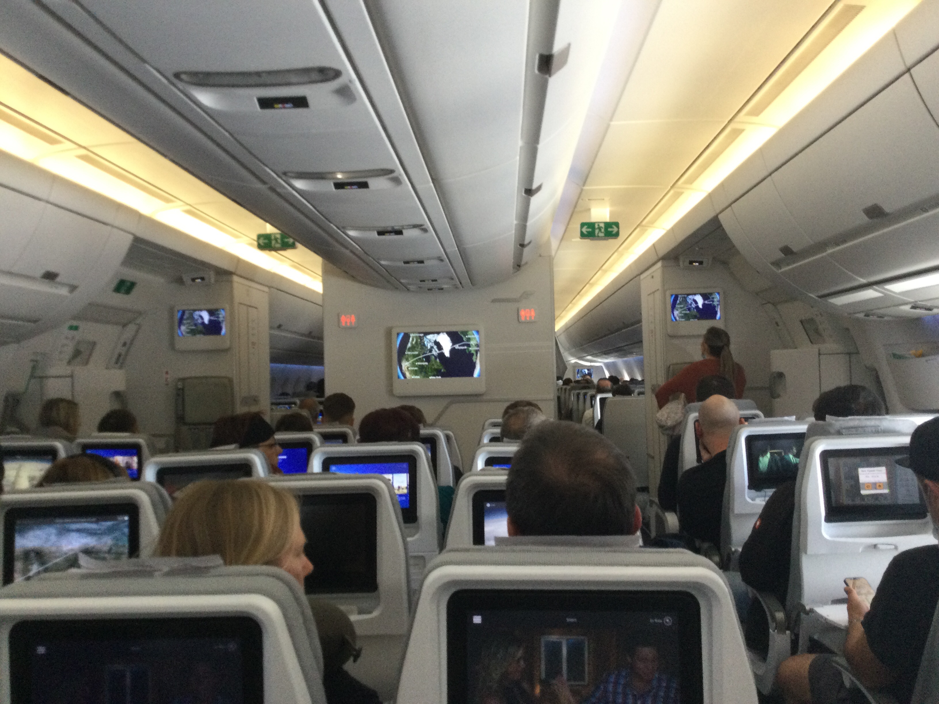 Jetzt war es so weit, Marions Weihnachtsüberraschung einzulösen. Unser USA-Abenteuer startete am Freitag, dem 20.05. um fünf Uhr morgens. Zusammen mit Sandra frühstückten wir und kurz nach sechs fuhren wir zum Flughafen Düsseldorf. Wir sind mit Sandras Auto gefahren weil wir darin am meisten Platz hatten. Bruce hatte schon am Tag zuvor gemerkt, das was im Busch ist und war der erste im Auto. Wir kamen gut durch und so waren wir um halb acht am Flughafen. Mein Versuch eines online Check in war am Tag vorher nur halb erfolgreich gewesen. Bei Marions Check in stand „bitte am Schalter melden“. Aber am Schalter gab es dann keine Probleme.