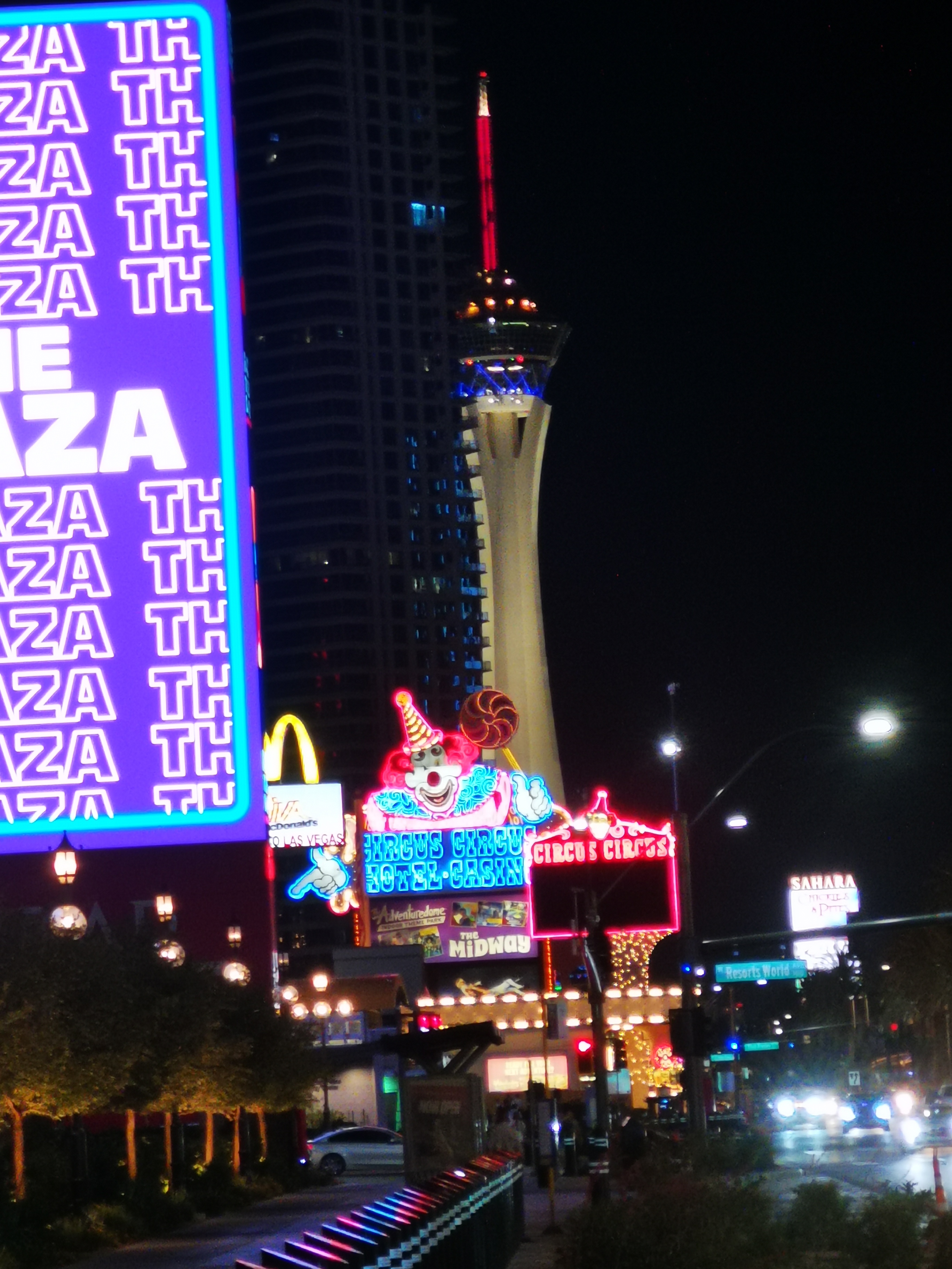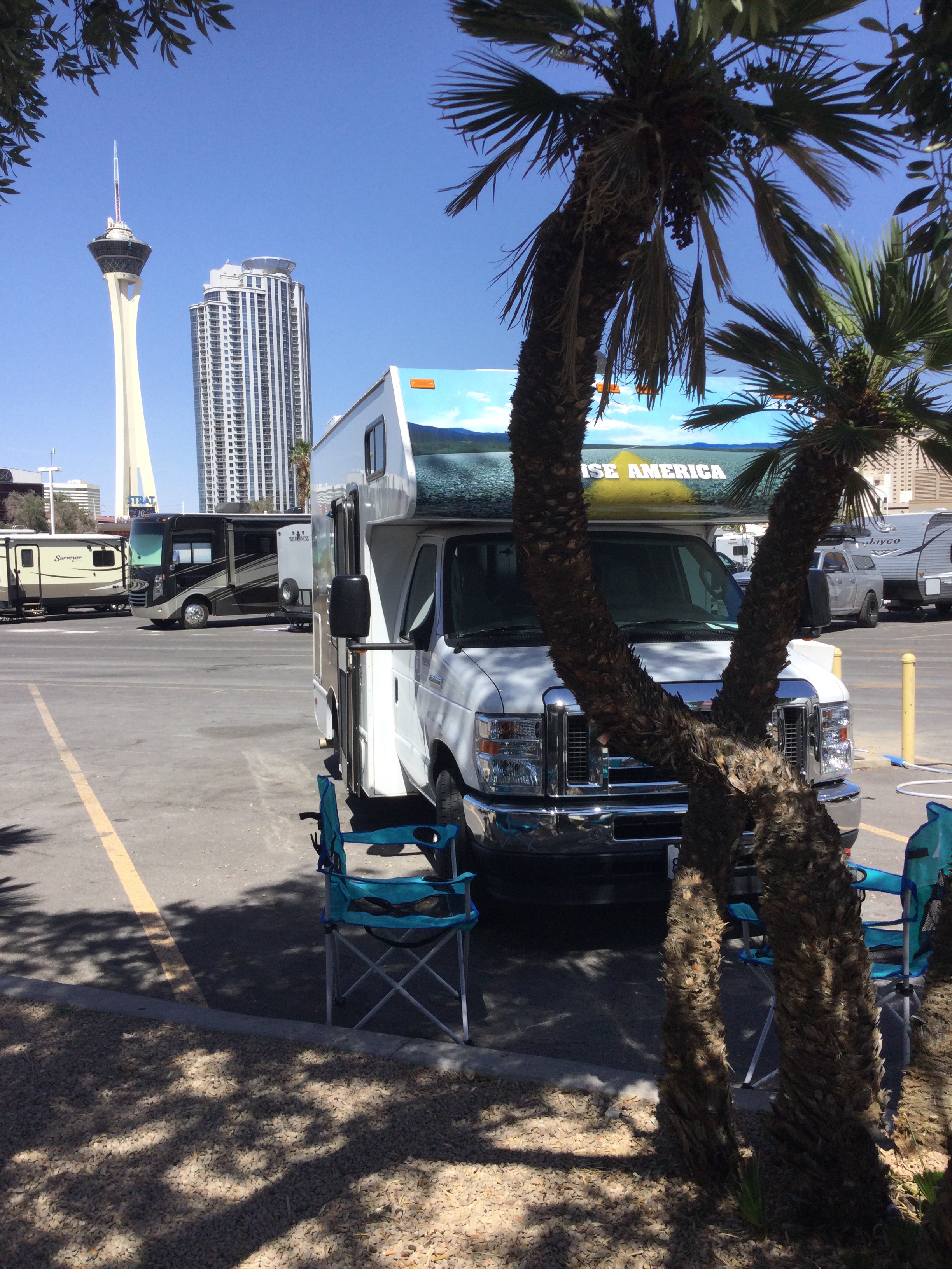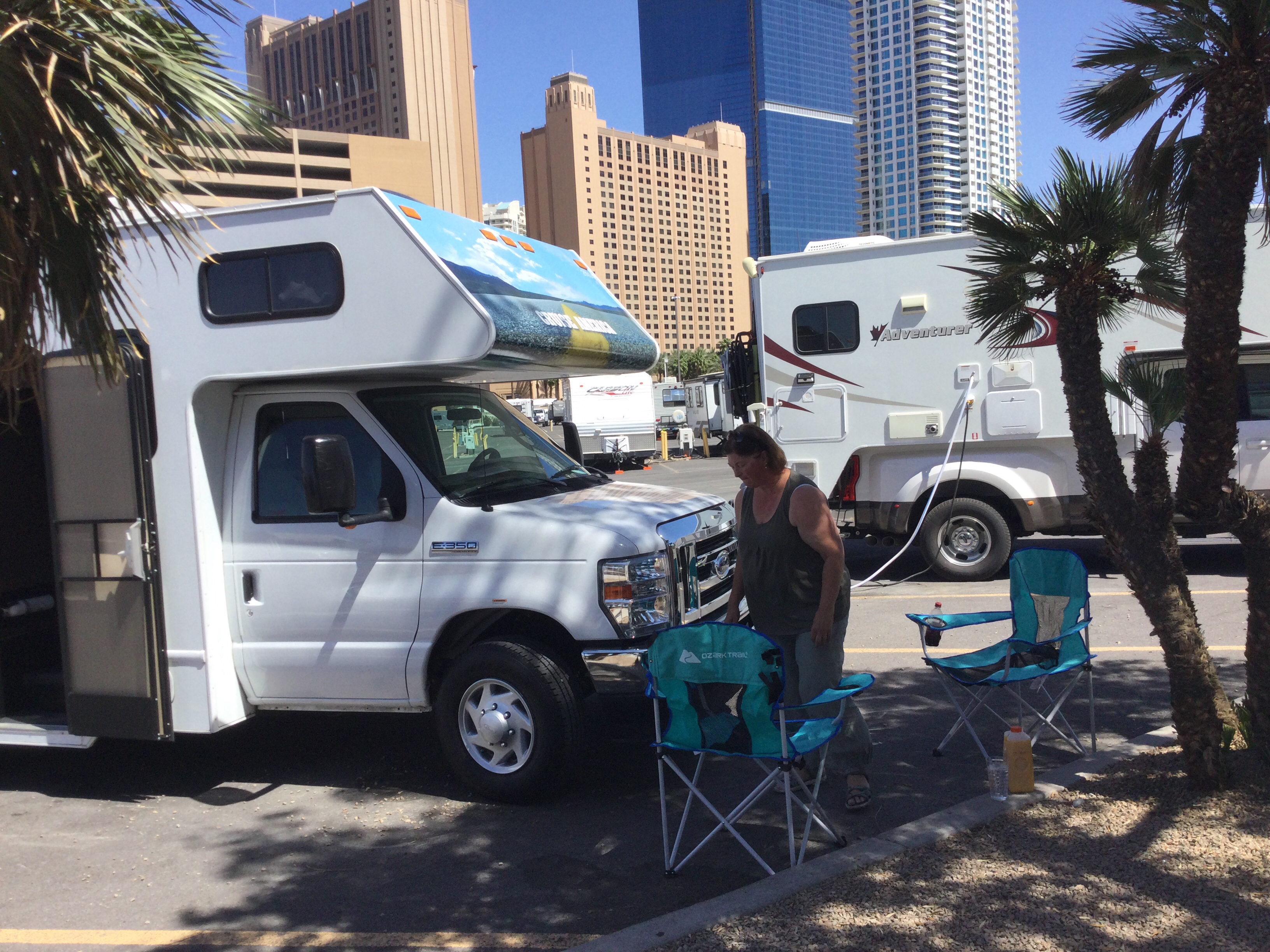 Von Walmart fuhren wir zurück nach Vegas. Den ersten Stellplatz hatte ich schon von Deutschland aus reserviert. Es war der RV-Campground von Circus Circus. Las Vegas besteht aus Beton, Teer und Steinen. Wirklich selten gibt es was grünes. Auch der Campground machte da keine Ausnahme. Aber wir hatten Glück. An der Stelle, an der wir standen, gab es ein paar Palmen und Stäucher. Sie, und das hohe Parkhaus dahinter, spendeten uns etwas Schatten. Die Hitze tagsüber ist wirklich nicht zu unterschätzen. Man hat die Wahl zwischen dem lauten Brummen der Klimaanlage oder schwitzen. Irgendwann entscheidet sich jeder für das Brummen.