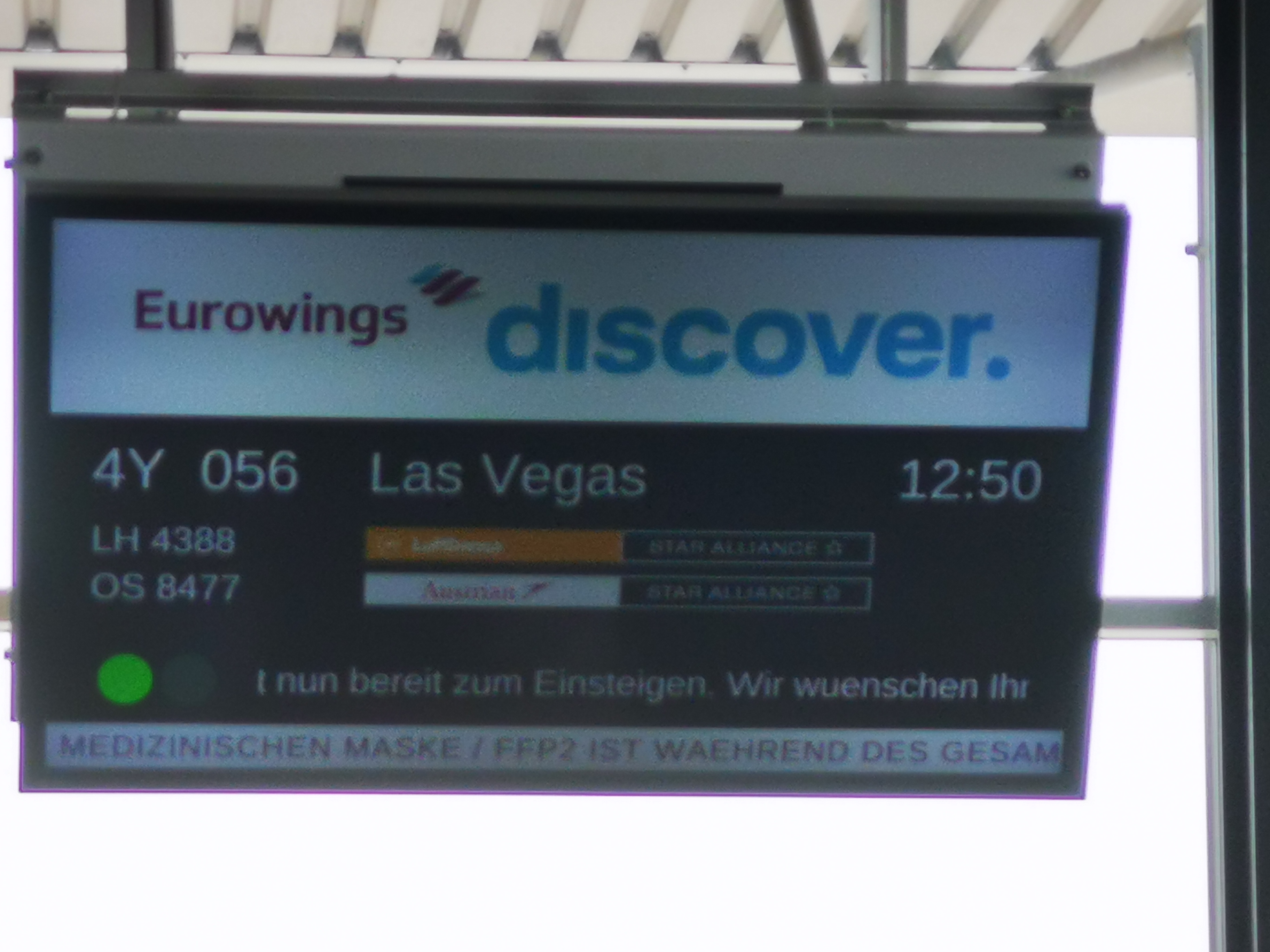 Aber zurück zum Flug. Wir hatten einen Zubringerflug von Düsseldorf nach München. In einem Anflug von geistiger Umnachtung oder einfach weil ich zu wenig Erfahrung hatte, habe ich nicht widersprochen als unser Reiseveranstalter mir den Reiseplan sendete. München liegt eigentlich in der entgegengesetzten Richtung wenn man von Lindlar in die USA will. Düsseldorf hatte ich damals gewählt weil ich dachte, daß von dort auch Flüge in die USA starten. Unser Stresslevel sollte aber noch ungeahnte Höhen erreichen. Der Flieger kam mit 10 Minuten Verspätung in Düsseldorf an. Wegen zu hohem Verkehrsaufkommen mussten wir dann nochmal 45 Minuten im Flieger warten. Damit war eigentlich schon klar das unsere Maschine in München nicht mehr zu erreichen war. Es stellte sich aber heraus, daß sie auf uns wartete. Wir erfuhren das aber erst im Landeanflug und bis dahin hatte ich mit einer Nacht in München gerechnet. Kennt jemand den Flughafen München? Der ist nicht sooo klein und man sagte uns das wir auf schnellsten Weg zu Gate C26 gehen sollten. Was uns keiner sagte war das Gate C26 in Terminal 1 ist und wir an Terminal 2 gelandet waren. Der Zeitplan gab uns 20 Minuten. Wir brauchten 30 und fanden nach einigen Fehlversuchen, total verschwitzt, das Gate. Das Bild von der Anzeigetafel habe ich um 13.09 Uhr aufgenommen. Der Plan war — Boarding um 12:50 wie die Anzeige sagt. Glücklicher Weise ging es wieder erst 25 Minuten später los. Wir flogen jetzt auch nicht mehr mit Lufthansa, sondern mit Finnair. C ´est la vie, Hauptsache es ging nach Las Vegas. Zumindest auf dem Hinflug wurde es für uns einmal nicht dunkel weil wir mit der Erdrehung geflogen sind.