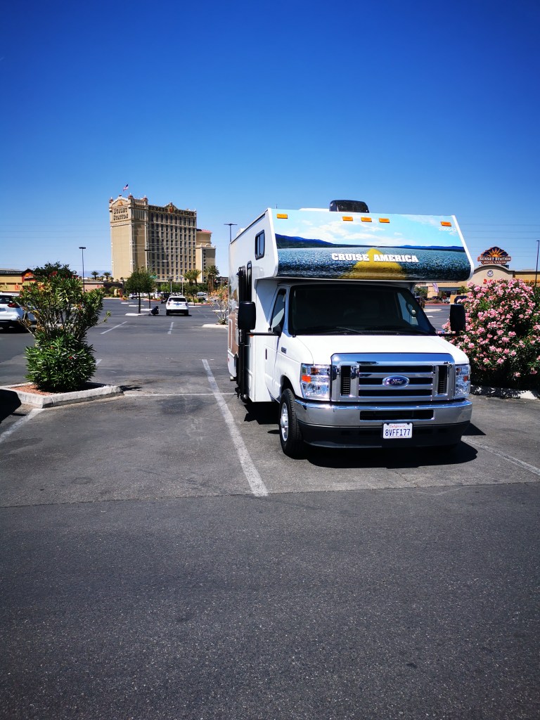 Am zweiten Tag in Las Vegas haben wir das Wohnmobil bei Cruise America in Henderson abgeholt. Vorher haben wir im Hotel gut gefrühstückt und dann den Verleiher angerufen. Es war noch nicht ganz klar wie wir zu ihm kommen sollten. Eigentlich war ein Shuttleservice gebucht. Letzten Endes sind wir mit dem Taxi gefahren und bekamen die Rechnung erstattet. Unsere Amerikanische SIM-Karte hat dabei schon gute Dienste geleistet. Die Fahrzeugüberhahme war problemlos und so ging unsere erste Fahrt zu Walmart um erst mal einzukaufen. Das Bild ist dort auf dem Parkplatz gemacht. Im Wohnmobil war schon das wichtigste an Geschirr und Besteck. Cruise Amerika lässt in den Fahrzeugen was andere Kunden zurückgelassen haben. So brauchten wir nur noch zwei Campingstühle, Toilettenchemie und Essen und Trinken.