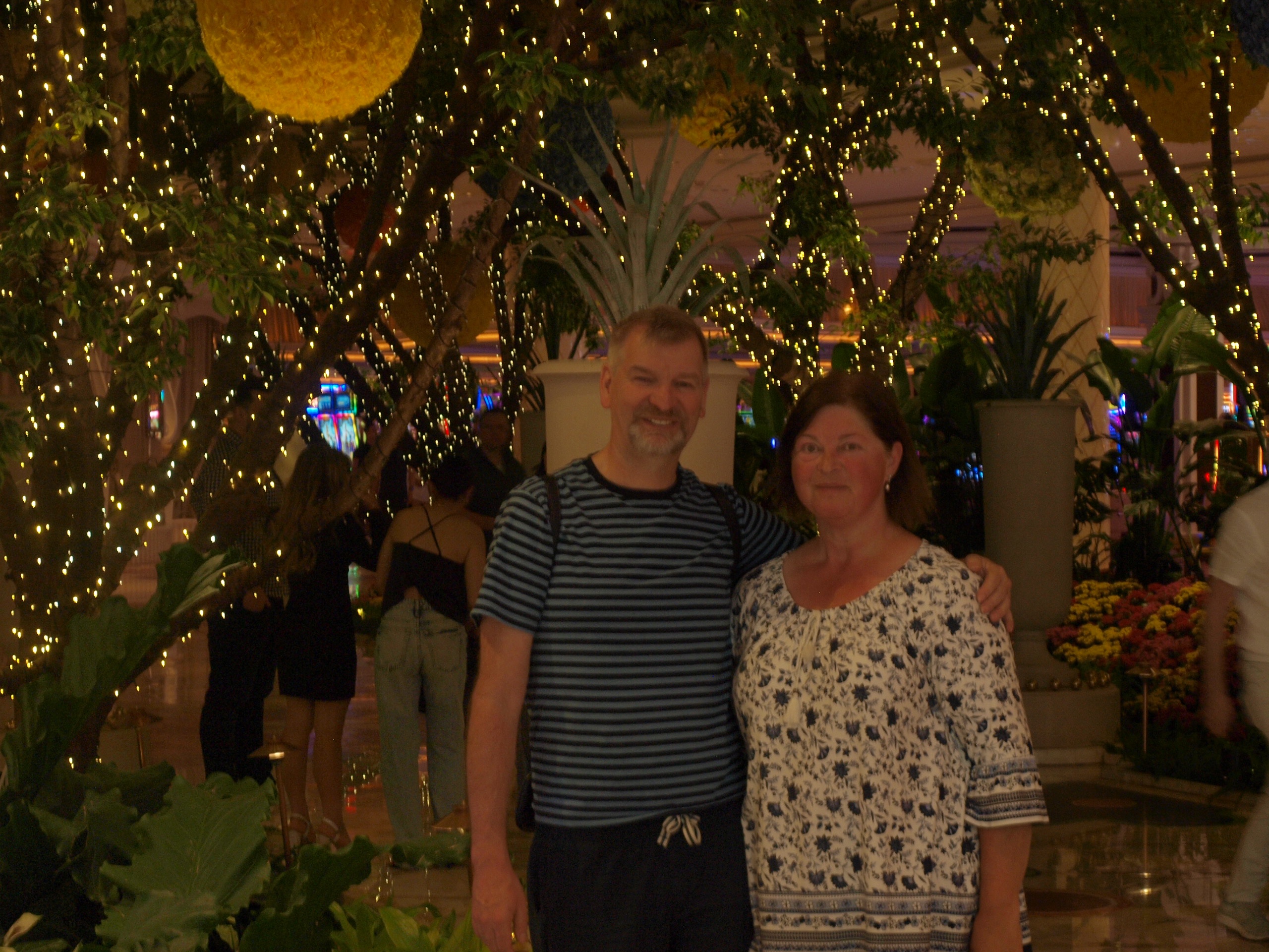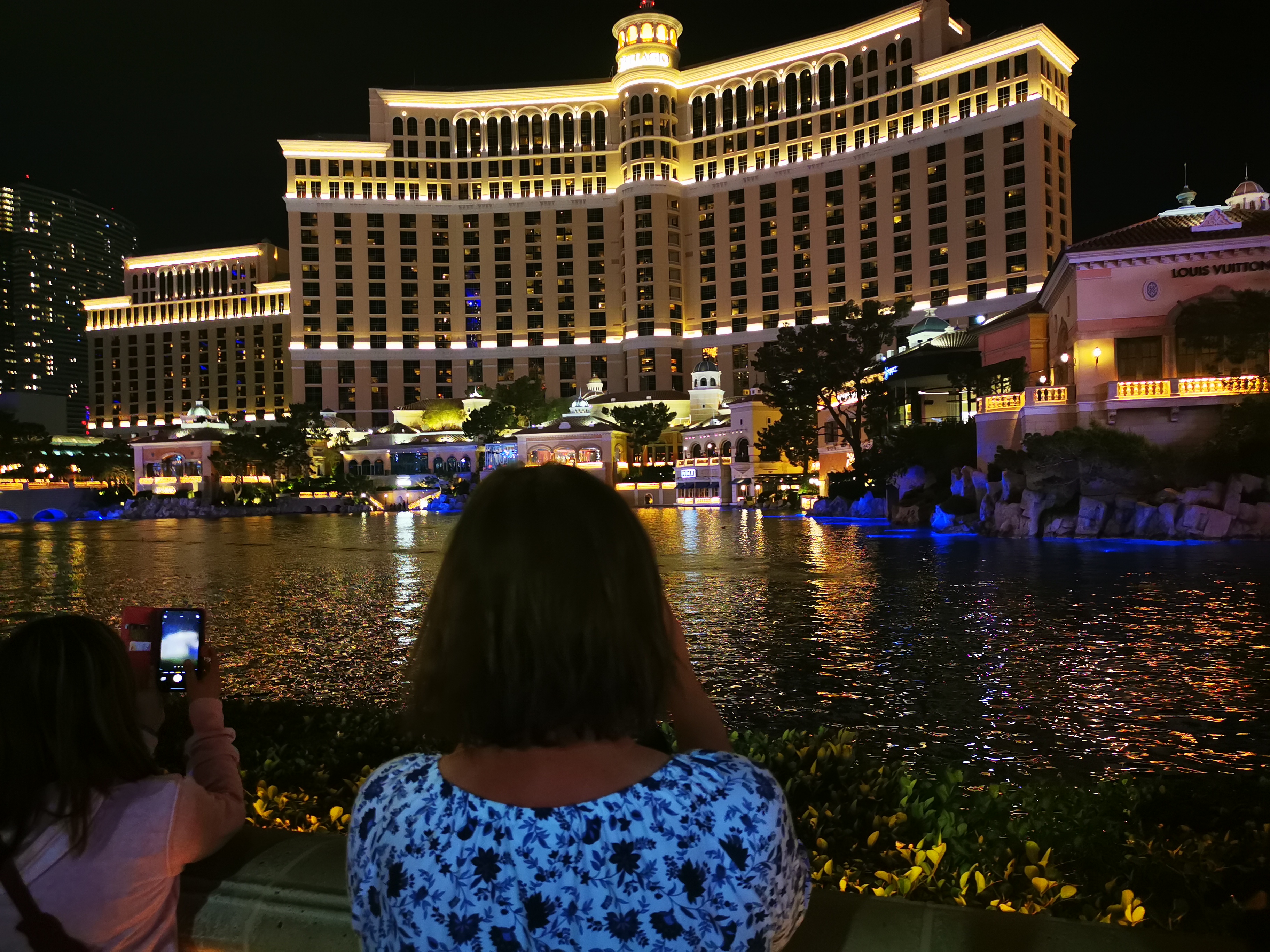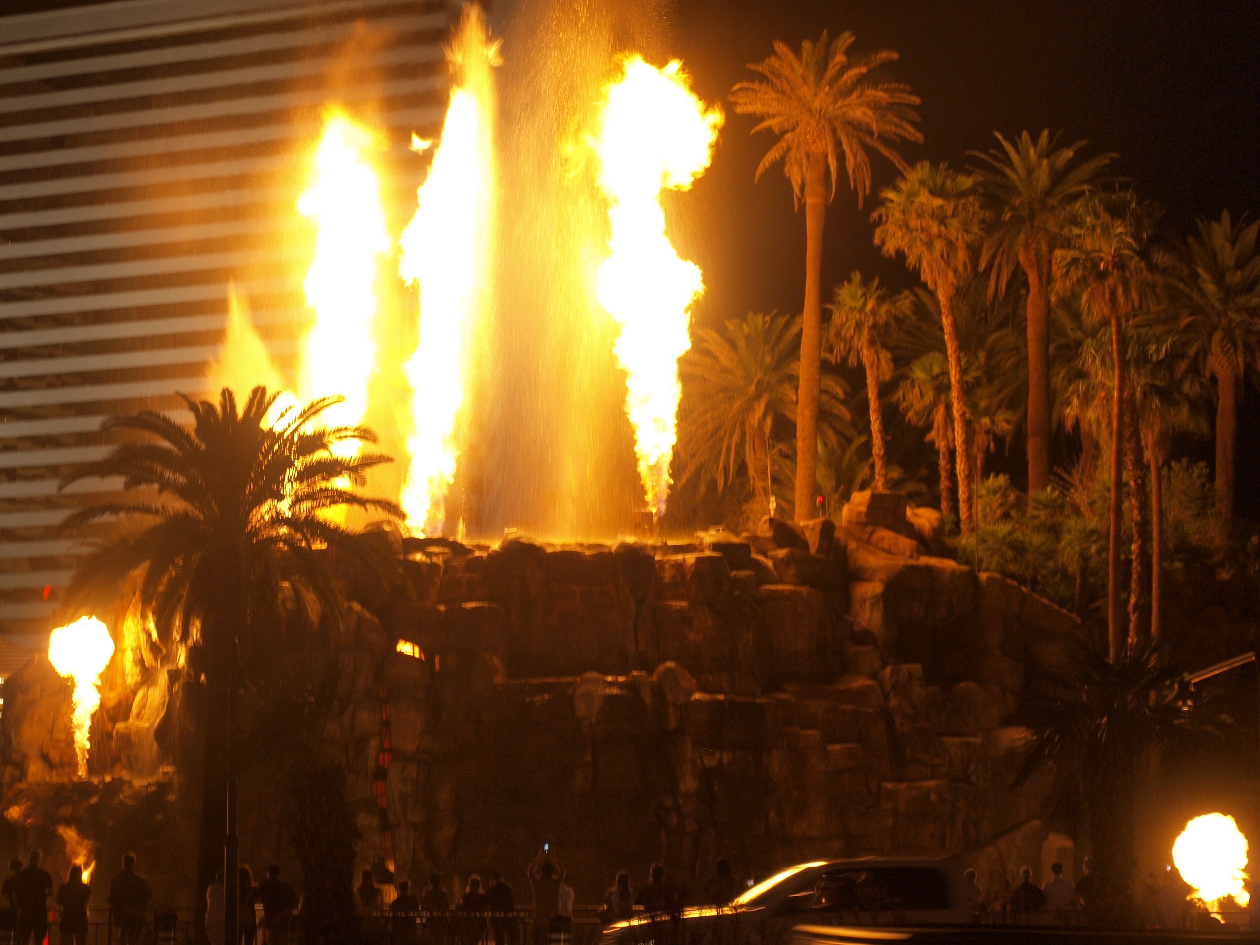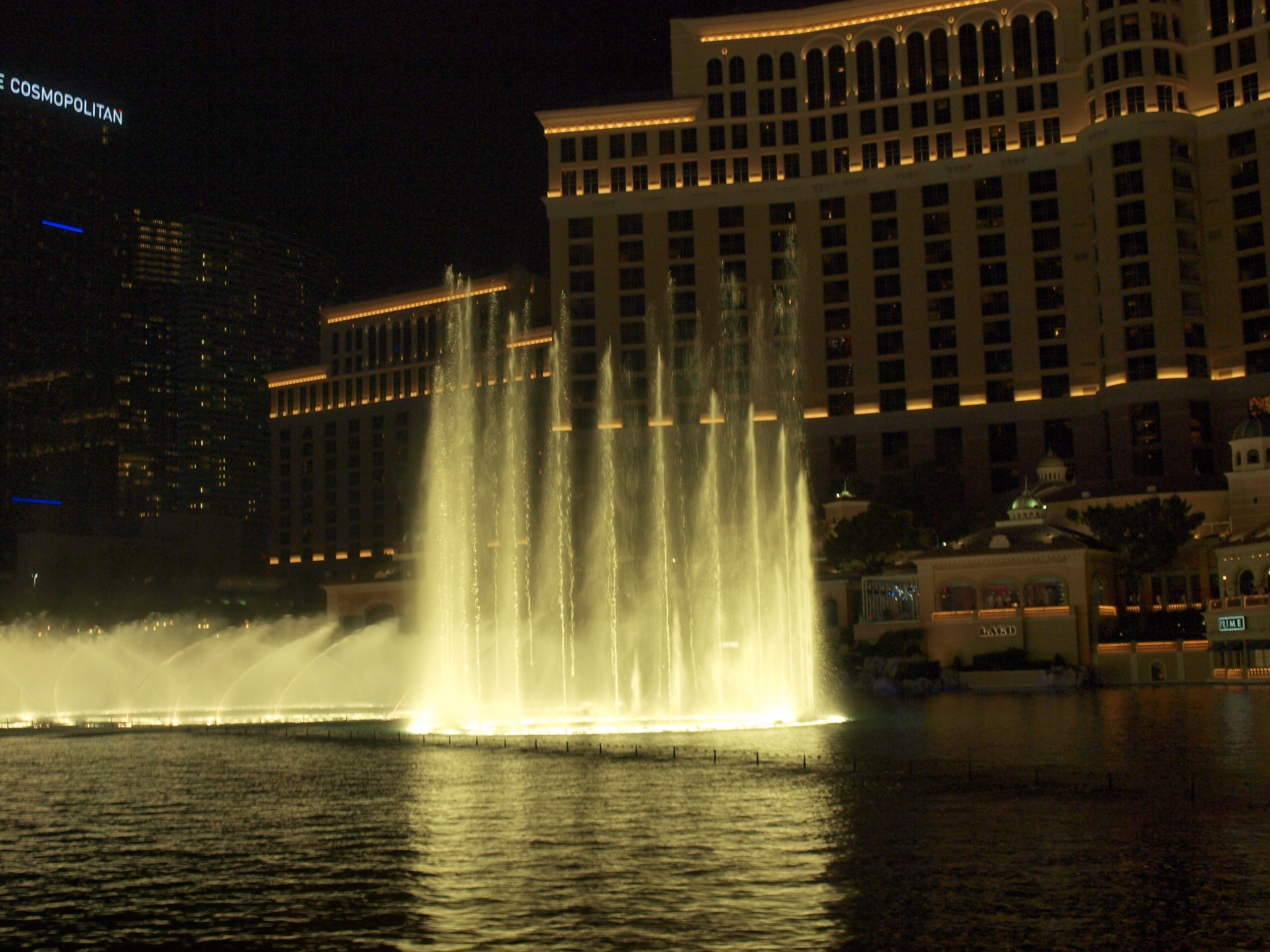 Wieder im Freien kamen wir gerade richtig um die Volcano Show des Mirage zu erleben. Den Strip weiter rauf kamen wir dann zu unserem Ziel. Ich hatte befürchtet nur aus der zweiten Reihe was zu sehen, aber wenn man nicht genau mittig stehen wollte, konnte man dafür ganz vorne sein. Die Wasserspiele und alles in Vegas waren sehr beeindruckend. Alles ist in Wahrheit noch größer als ich mir es vorgestellt hatte. Die Leute sind freundlich, auch wenn die Wachleute in jedem Laden vermuten lassen, daß auch genug Kriminelle unterwegs sind. Für zwei Tage fanden Marion und ich es sehr sehenswert. Aber wir freuten uns auch schon auf die Fahrt ins Valley of Fire am nächsten Morgen.