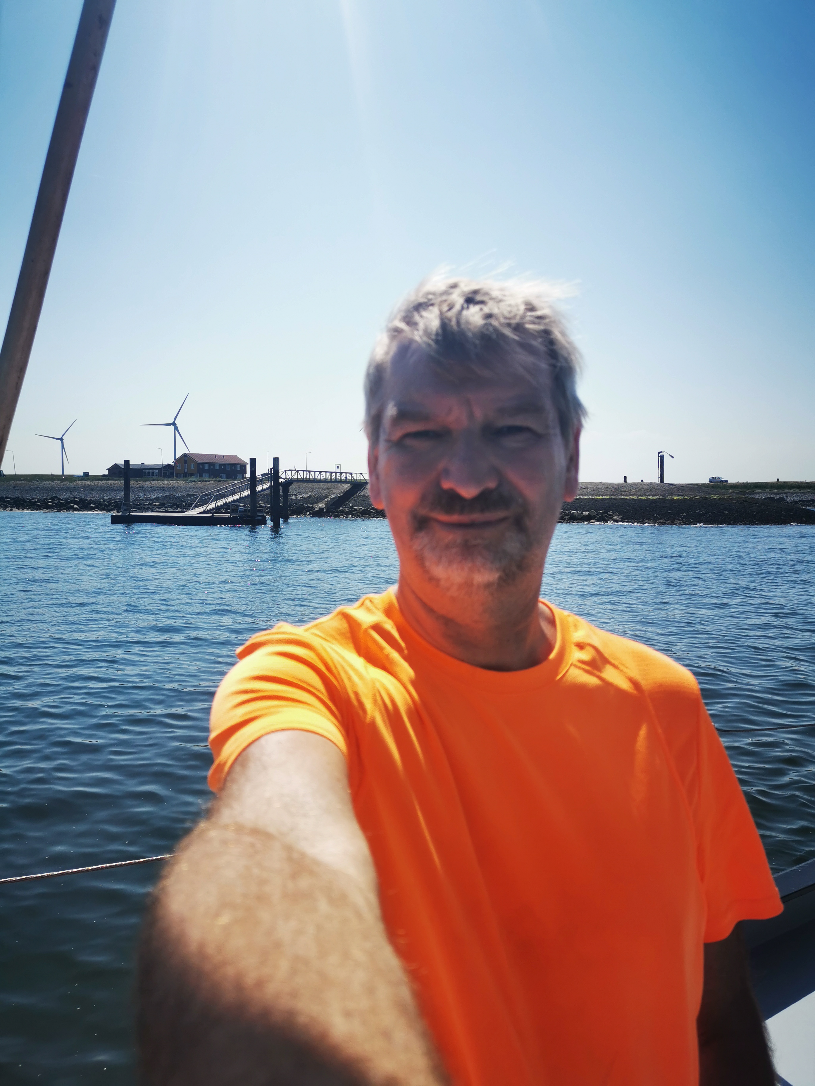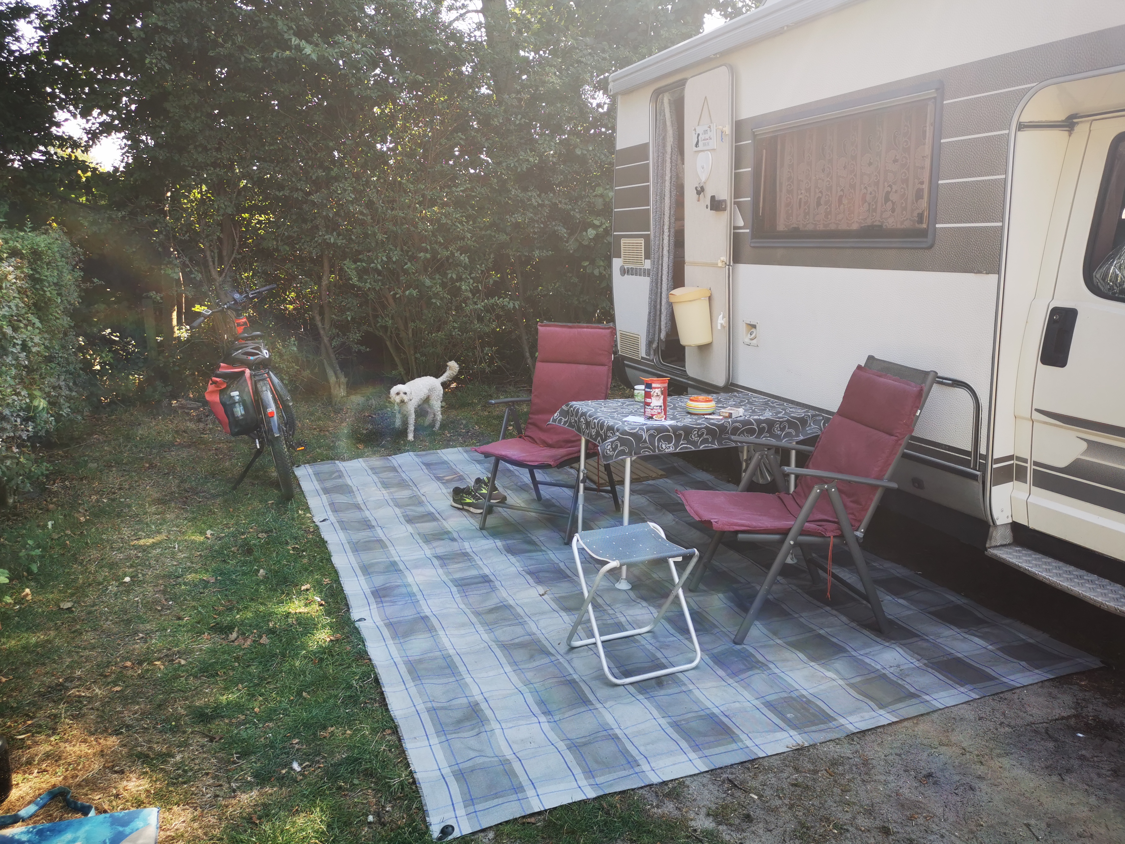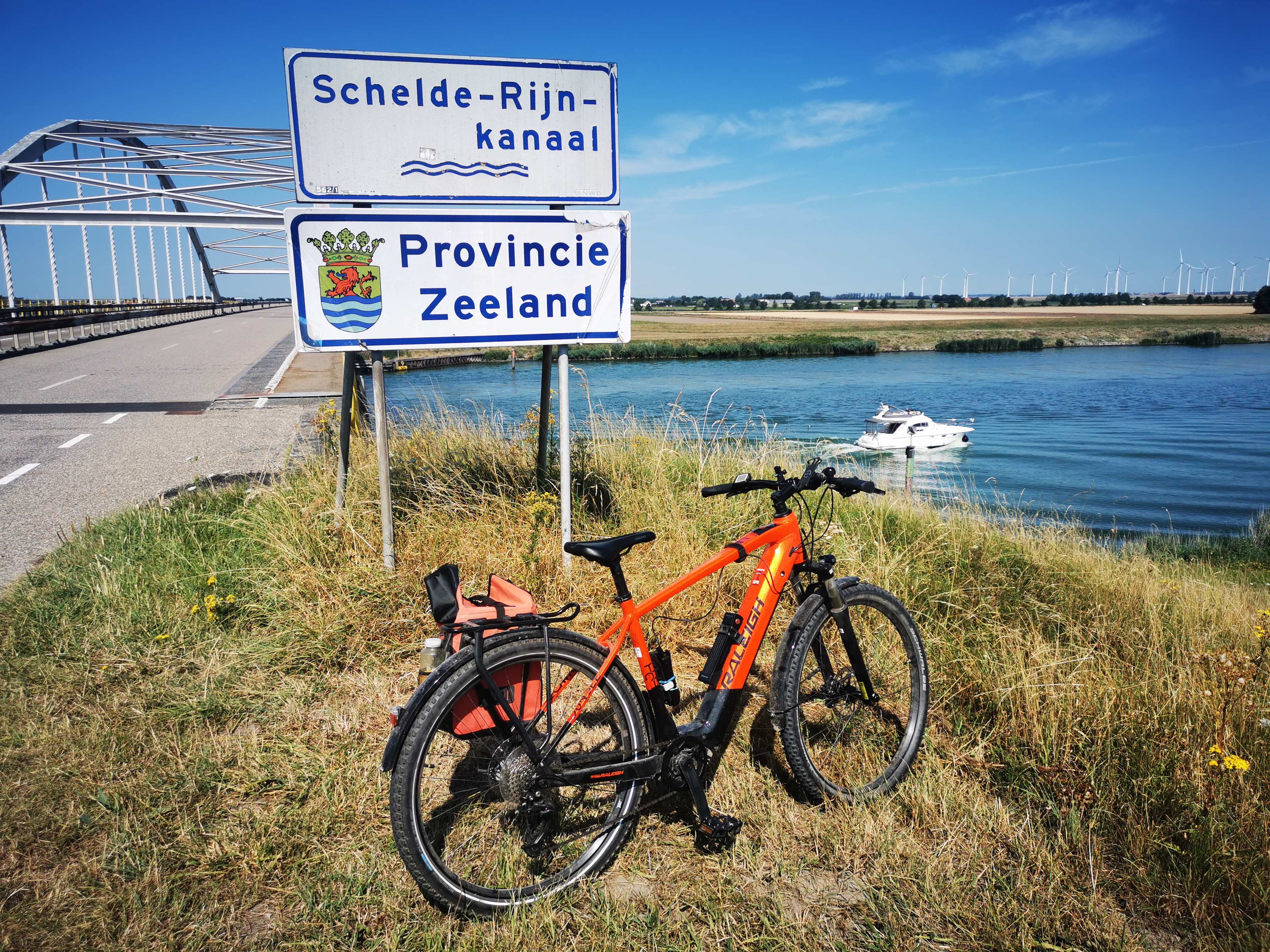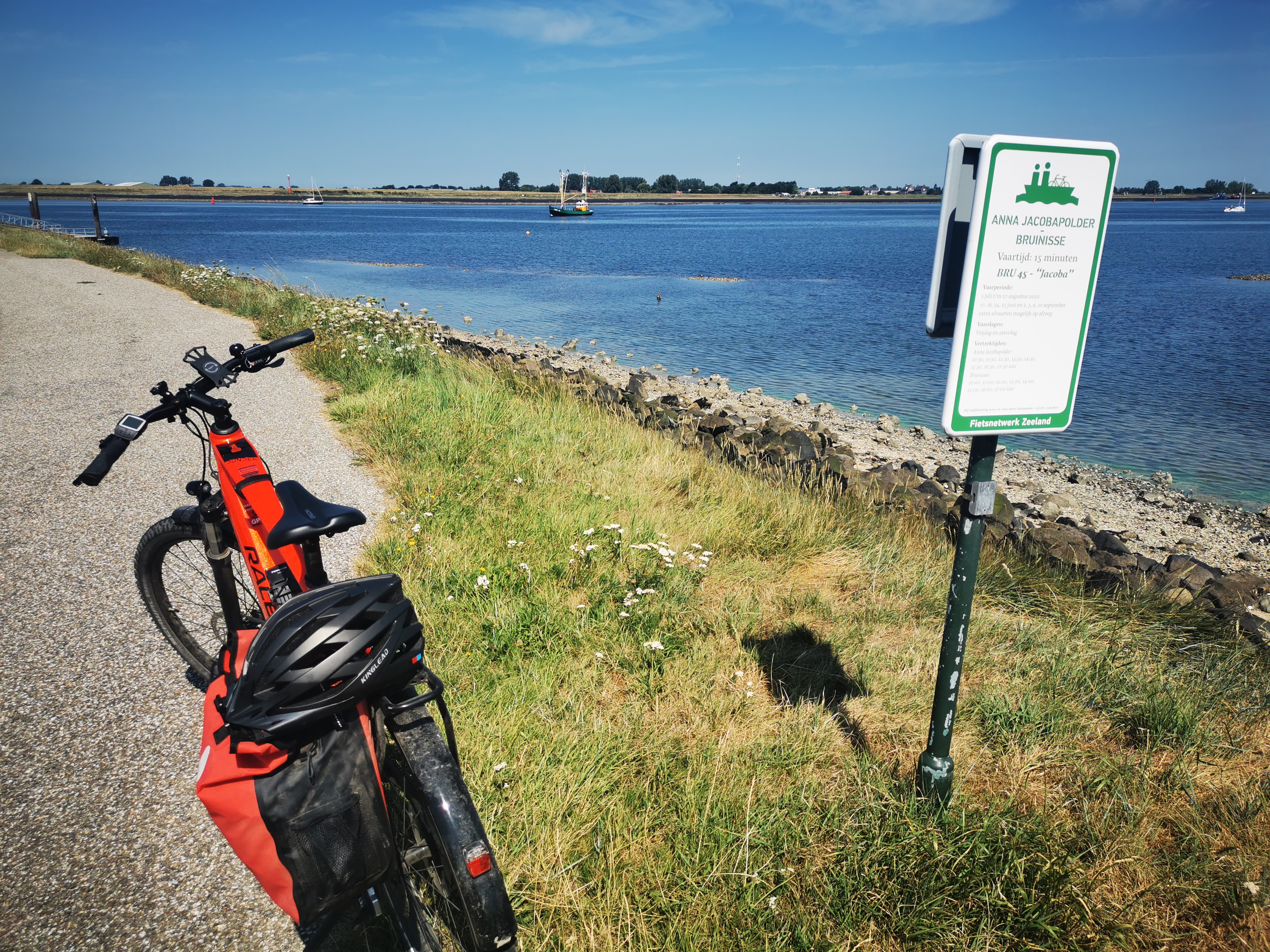 Nach dem Frühstück im Hotel habe ich mich gleich auf den Weg gemacht. Ich kam nochmal durch Breda und trank einen Kaffee. In Oudenbosch war ich echt beeindruckt von der Basilika. Ich hatte nicht damit gerechnet in der holländischen Provinz einen kleinen Petersdom zu finden. Ich machte eine Rast und kaufte mir einen Smoothie. Mein nächster Halt war schon am Meer. Es war zwar nur die Oosterschelde, aber trotzdem. Bei Anna Jacobapolder musste ich auf die Fähre nach Bruinisse warten. Bei dem Sonnenschein und der Aussicht kein großes Opfer. Die Fahrradfähre war ein umgebautes Fischerboot und die Überfahrt machte richtig Spaß. Das nächste Highlight war Zierikzee. Die Stadt ist wirklich sehenswert und mein Mittagessen, eine Fischsuppe, war sehr lecker. Über die Zeelandbrücke ging es dann nach Colijnsplaat. Ab da hätte ich keine App mehr gebraucht, aber wir waren uns sozusagen einig am Meer entlang zu fahren. Am Roompot Campingplatz von Kamperland habe ich noch eine Stop eingelegt. Der restliche Weg war ein Klacks. Um kurz nach 16 Uhr war ich am Wohnmobil wo Marion und Bruce schon warteten.