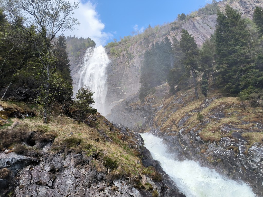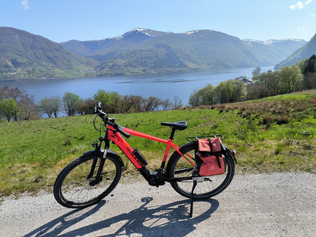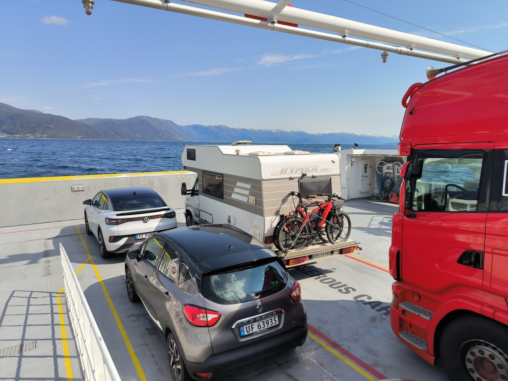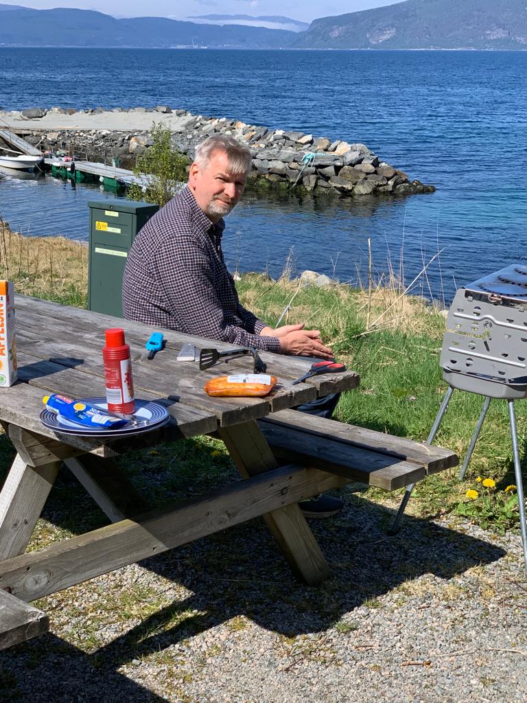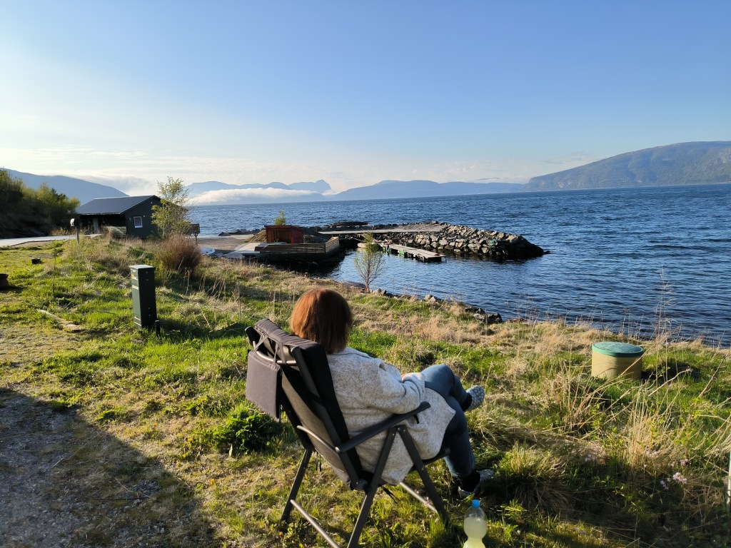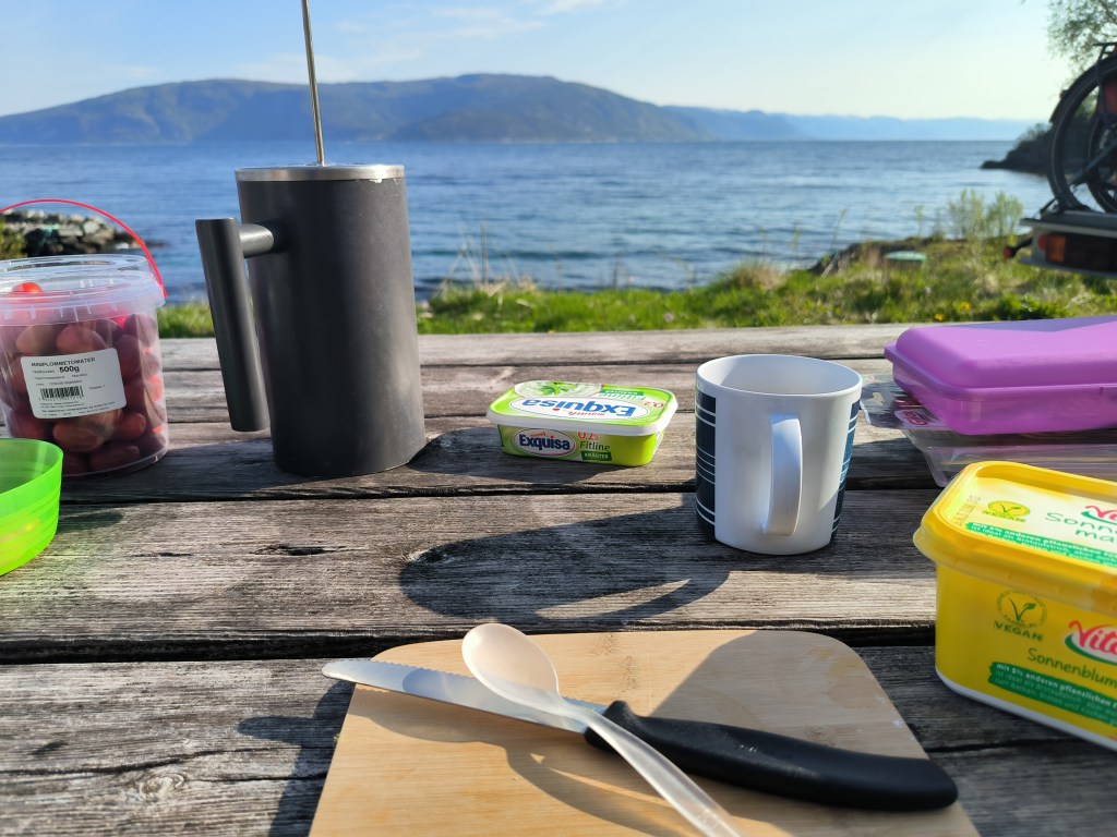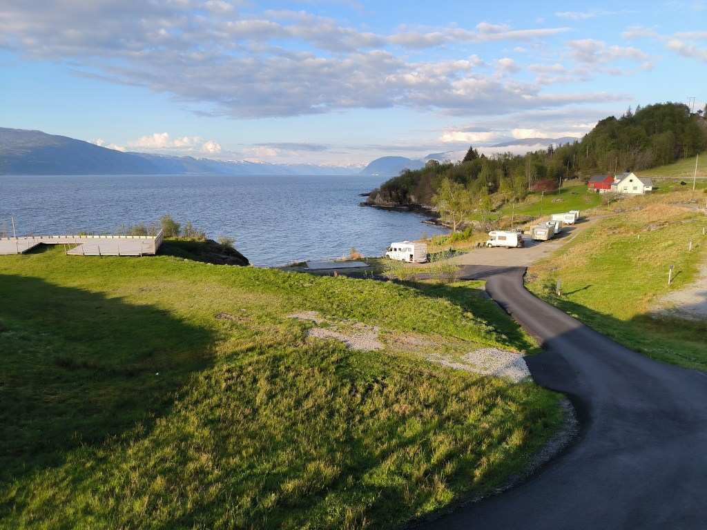 12.05.23 Am Sognefjord suchten wir uns einen Campingplatz, http://botnencamping.com/ Die meisten der Gäste sind sicherlich Angler, aber es gibt auch einen Iglu aus Acrylglas zu mieten, mit Blick auf den Fjord und die Sterne. Der Platz gefiel uns und wir beschlossen einen zweiten Tag zu bleiben. Der Tag begann mit Nebel über dem Fjord. Nachdem er sich verzogen hatte, war es ein sonniger Frühlingstag. Wir angelten, grillten und ich bin mit dem Rad unterwegs gewesen. Am 14. ging es weiter. Bei schönstem Wetter konnten wir draußen frühstücken.