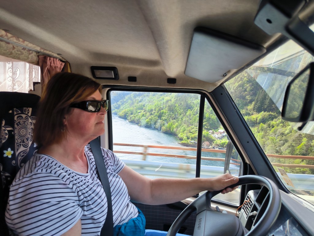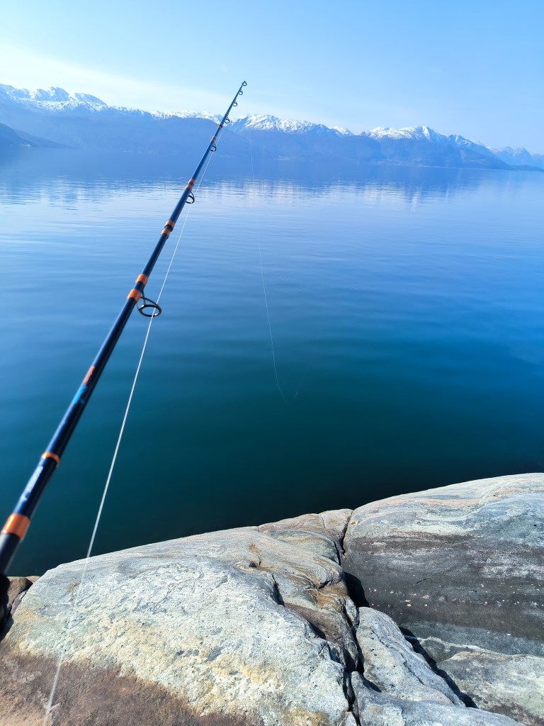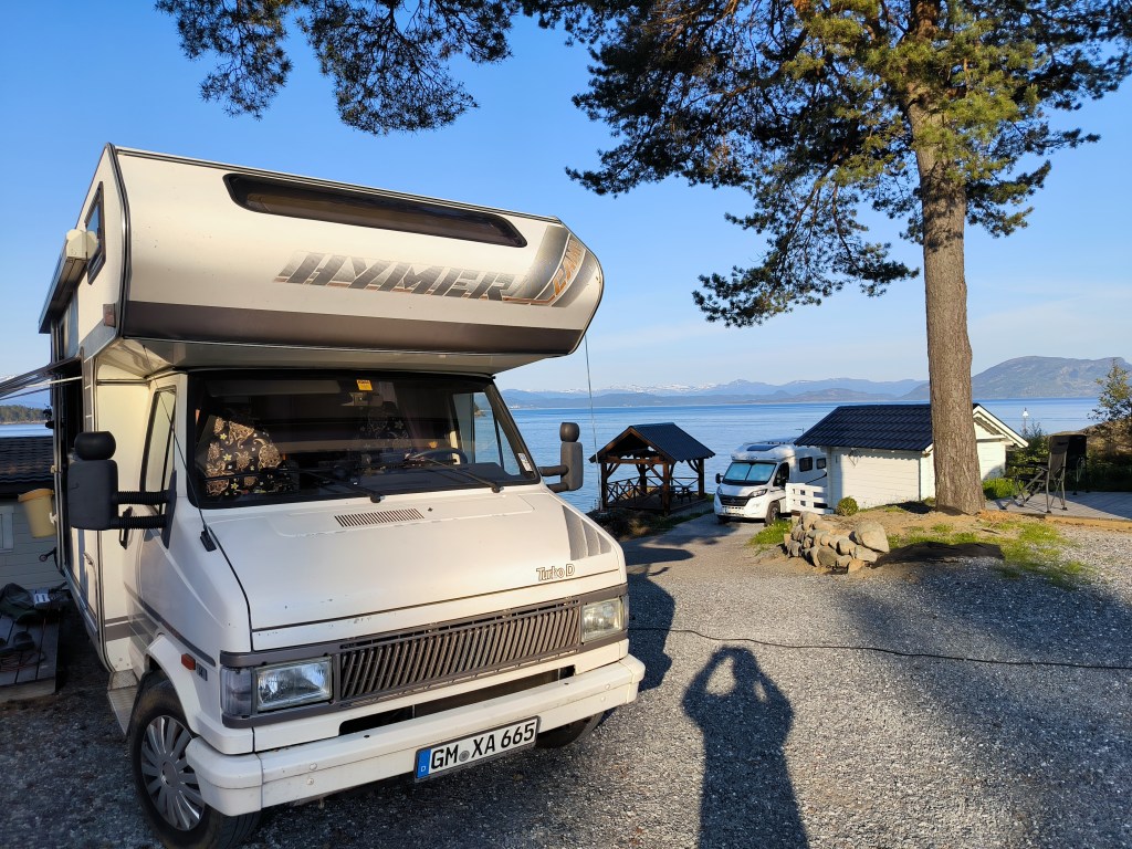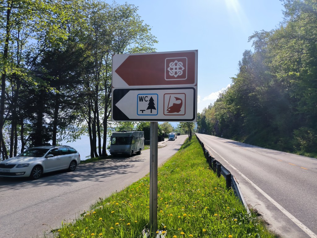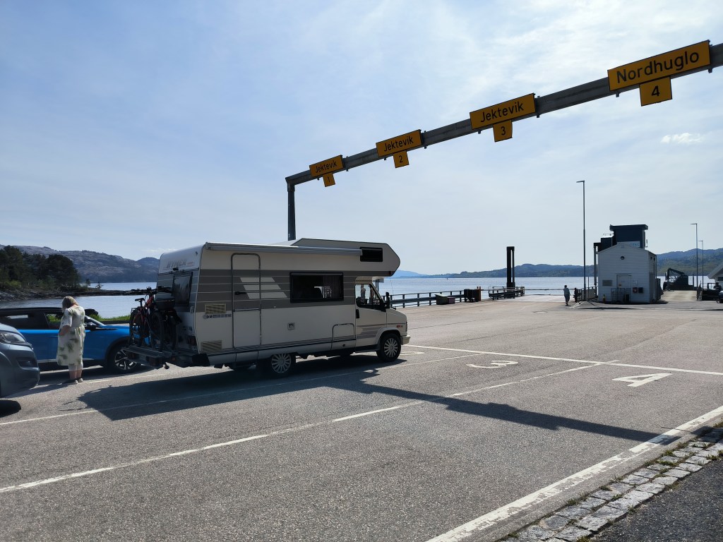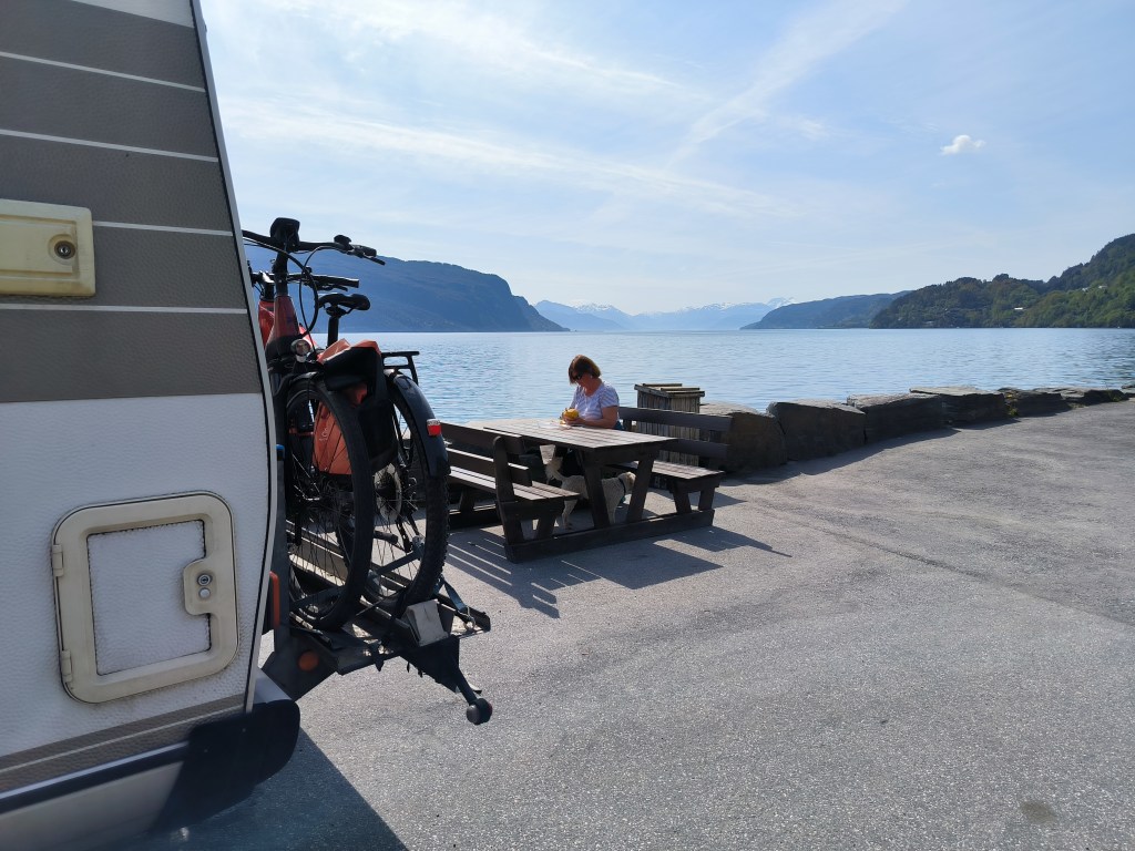 Nach Vangsnes wollten wir an die Küste. Wir beschlossen am Hardangerfjord entlang zu fahren und hatten als Ziel den Ort Fitjar auf der Insel Stord. Laut Internet ein beliebtes Ziel für Segler mit netten Geschäften am Hafen. Aber erst einmal waren wir begeistert vom Hardangerfjord. Nachdem wir wieder durch die Berge gefahren waren, fanden wir am Fjord einen Parkplatz mit WC und Angelmöglichkeit. Sowas ist in Norwegen extra ausgeschildert und die sanitären Anlagen sind immer sauber und modern. An dem Platz blieben wir eine Nacht. Natürlich angelten wir auch, aber leider ohne Erfolg.