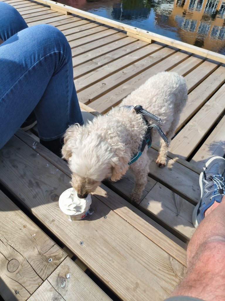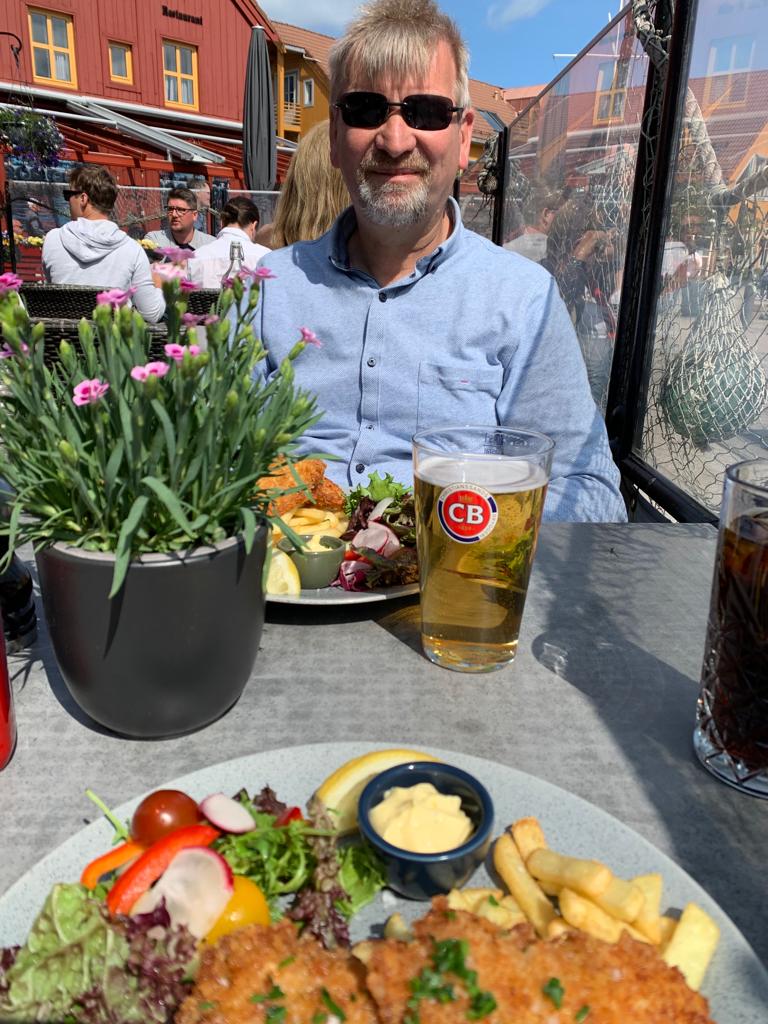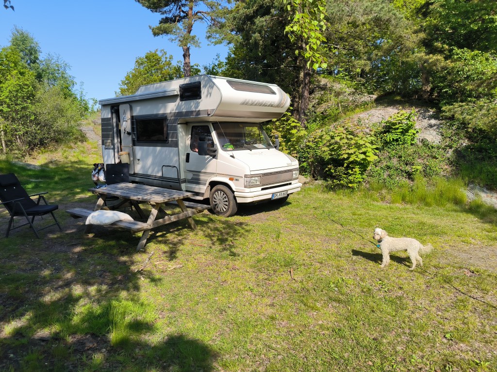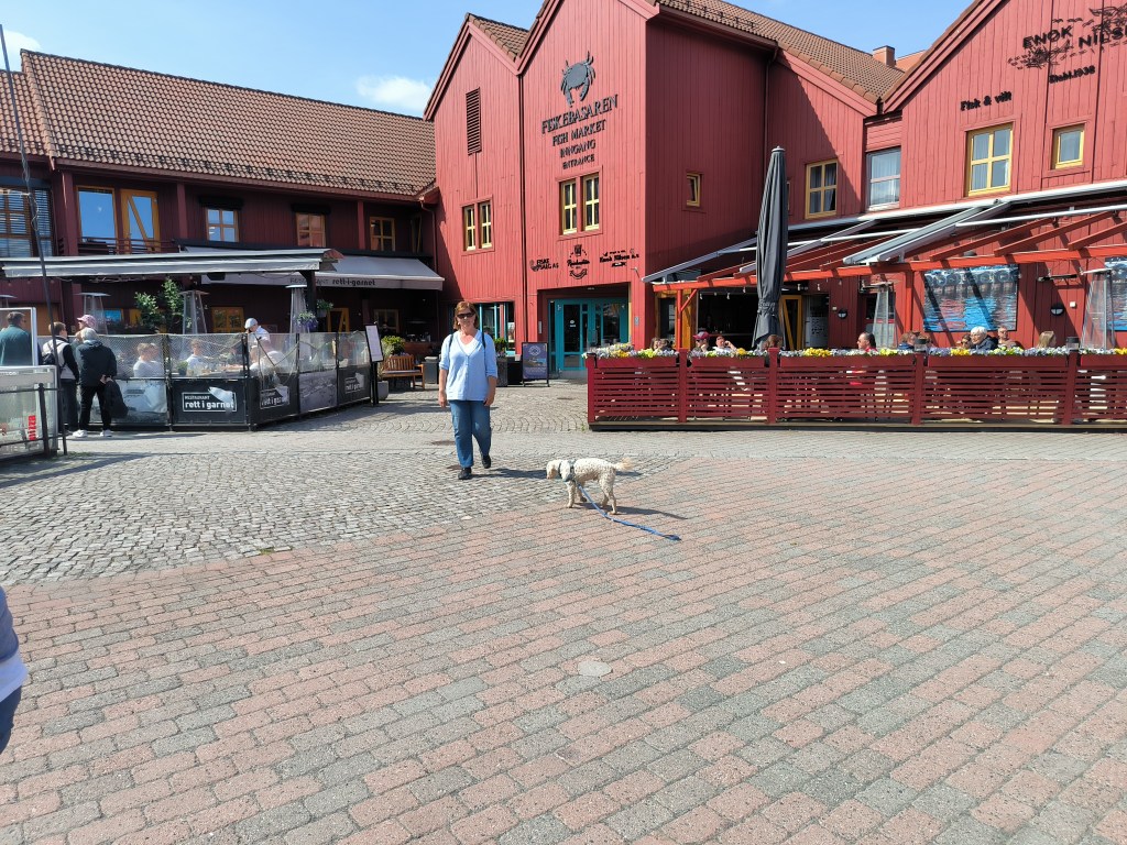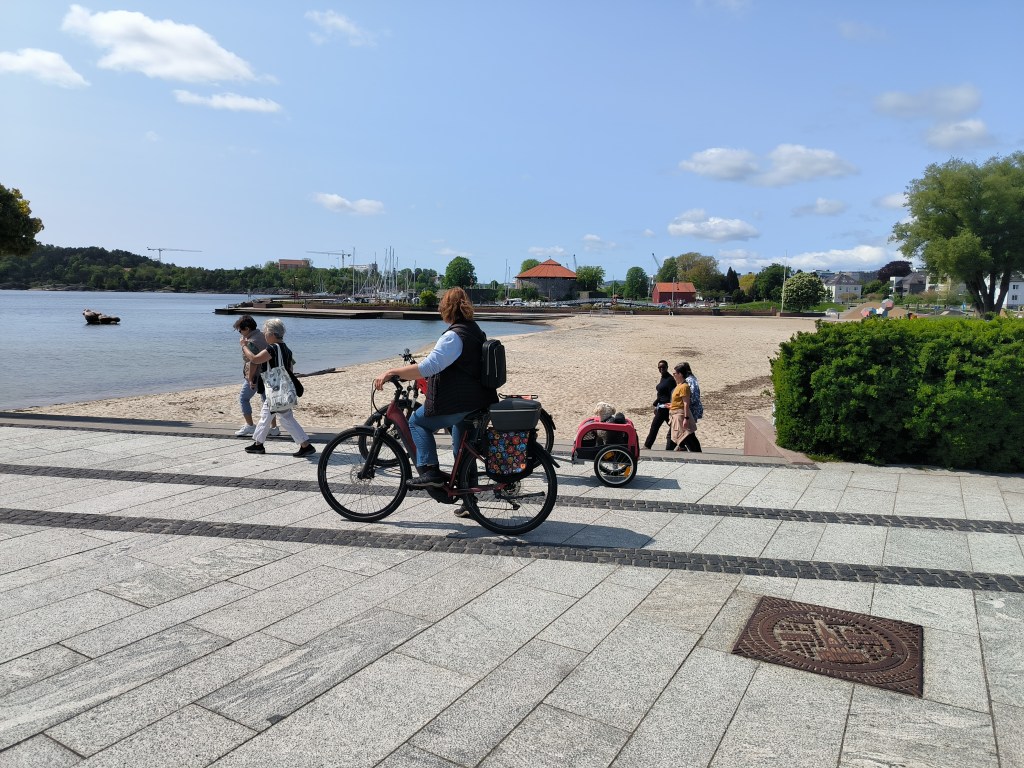 Am nächsten Tag wollten wir eigentlich nur wenige Km weiter fahren, zum Bobilcamp in Farsund, so heissen in Norwegen Wohnmobilstellplätze, die meist von der Gemeinde vermietet werden. In Borhaug war das auch so und man konnte Bargeld in einen Briefkasten werfen. In Farsund war die Bezahlung nur über eine App (Vipps) möglich. Da wir die nicht hatten und es Marion immer noch nicht gut ging, sind wir kurzerhand schon einen Tag früher nach Kristiansand gefahren. Während Marion sich ausruhte, habe ich mit dem Rad die Stadt erkundet. Mit Bruce war ich am Strand, der direkt vor unserem Campingplatz Roligheden liegt. Leider war das Wasser noch zu kalt zum schwimmen obwohl wir einen schönen Sommertag hatten. Am nächsten Tag ging es Marion besser und wir waren mit den Rädern in der Stadt. Auf dem Fischmarkt haben wir Fish and Chips gegessen und es gab Eis. Bruce hatte sogar sein eigenes Softeis.