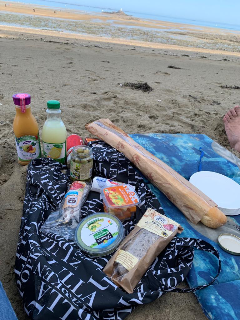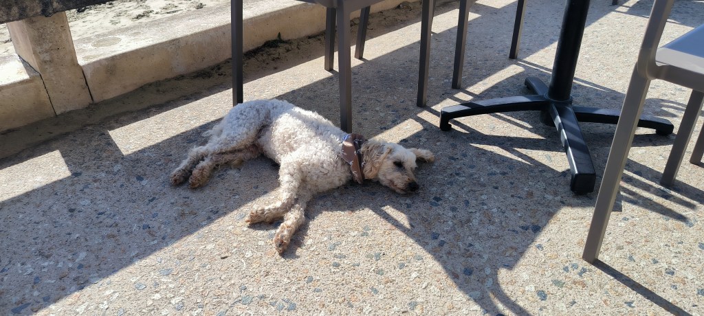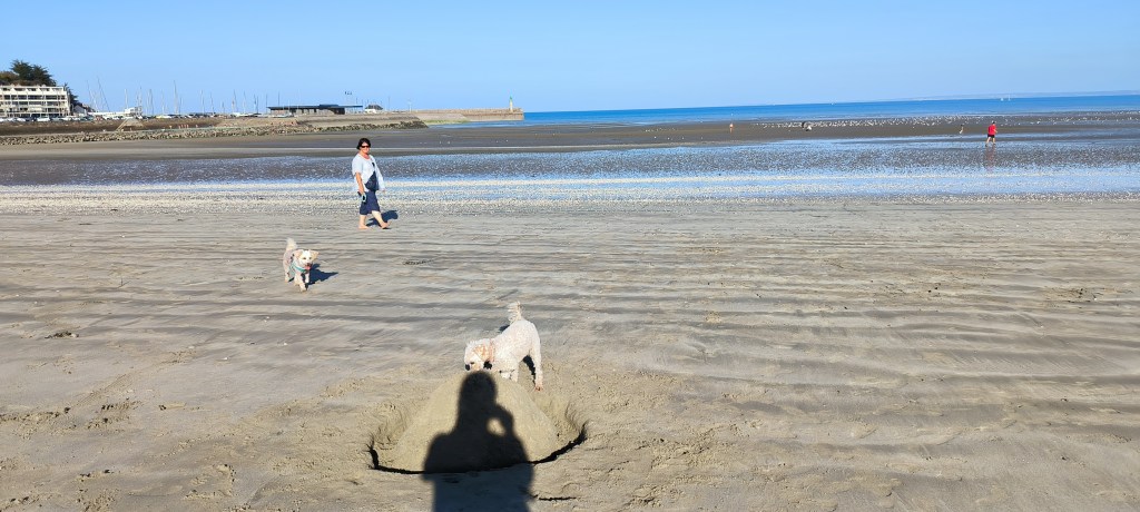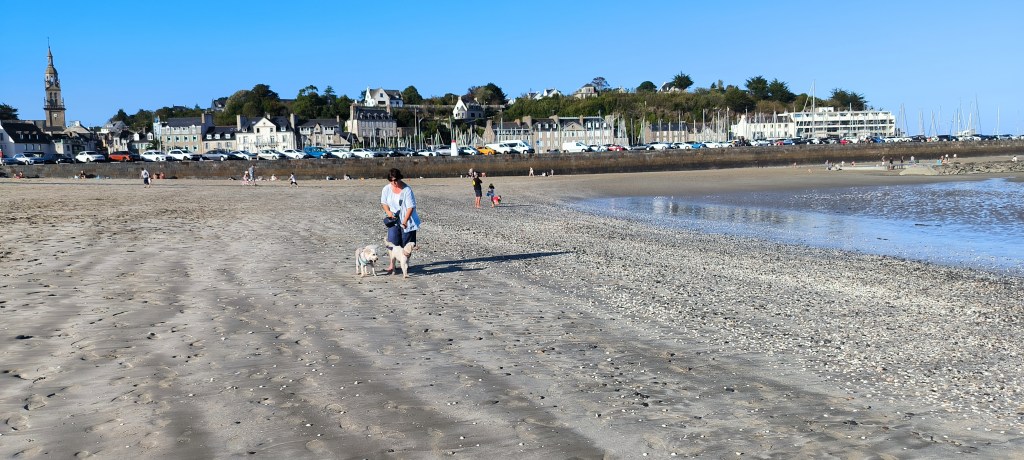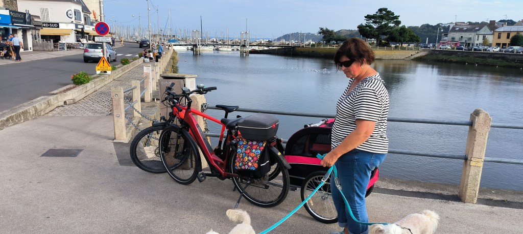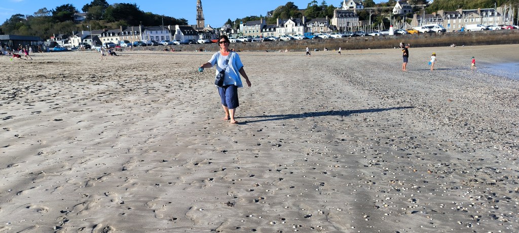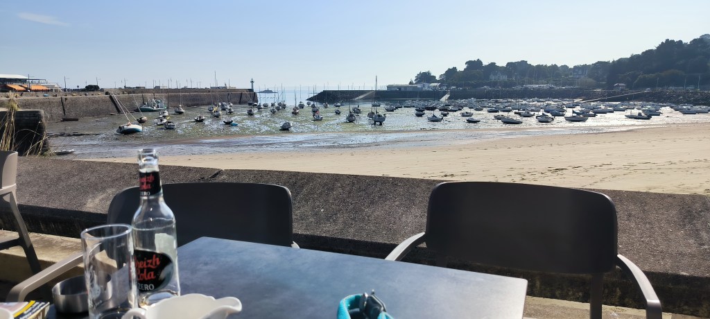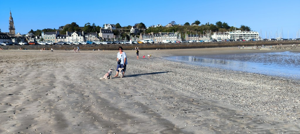 Der Morgen des 2. Okt. ist diesig bis vernebelt. Bruce und ich waren erst Mal eine Runde joggen. Wir beschlossen beim Frühstück mit den Rädern nach Saint-Quay-Portieux zu fahren. Dabei kommt man wieder durch Binic und wir halten auf einen Kaffee. Unser nächster Halt ist der Strand „Plage du Moulin“. Hier gibt es auch Stellplätze für Wohnmobile. Wir sind etwas über den Strand spaziert und dann weiter gefahren. In Portieux haben wir erst mal den Hafen erkundet und dann die Stadt. Der Ort ist ziemlich mondän, kein Vergleich zu Saint Brieuc. Am Hafen haben wir gesessen und die Sonne genossen. Die Hunde haben sich lieber in den Schatten verzogen. In einem Supermarkt kauften wir alles für ein Picknick und fuhren zurück zum Strand. Dort waren inzwischen viele Leute und suchten nach Muscheln. Die Polizei kontrollierte ob sie auch nur die erlaubte Größe sammelten. Insgesamt ein schöner Tag, den wir uns mit einem Bier und Cider in Binic versüßten.